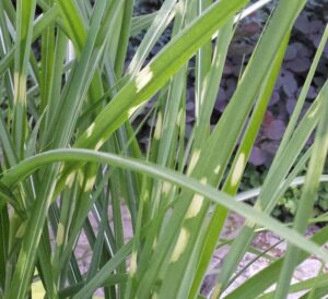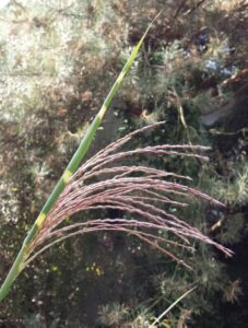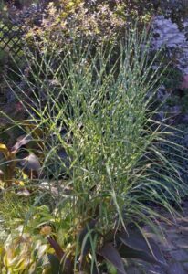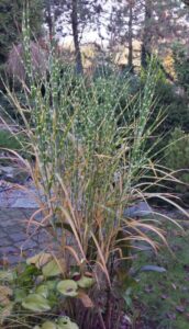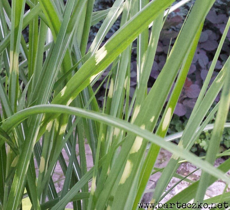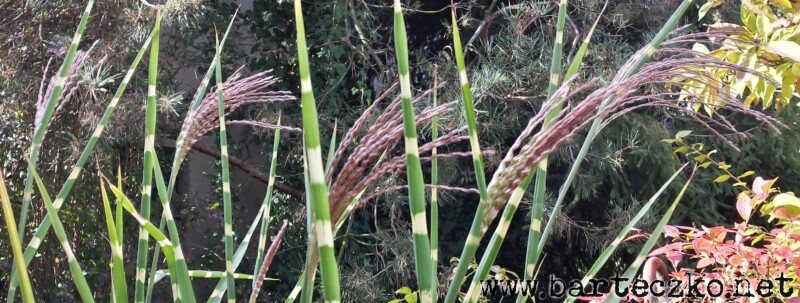 Miskant chiński (Miscanthus sinensis)”Zebrinus” to dość wysoka, bo dorastająca do 2 metrów trawa tworząca duże, silne kępy. Czyli bylina. Bardzo malownicza i widowiskowa. Liście ma sztywne, proste, u dołu nieco się przewieszające. Liście są w szerokie, poprzeczne, żółte pasy. Warto dodać, że wybarwia się nieco później – nie zaraz wiosną, ale tak pod koniec maja. Po dobrych 20 latach uprawy zakwitł mi tak ze 3 razy, w październiku: kwiatostany są bardzo ładne – delikatnie brązowawo-różowawe, pofalowane i zwiewne. ogólnie śliczny efekt.