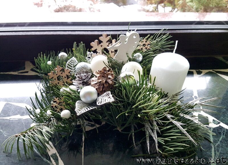 Biały aniołek oznajmia nadejście Bożego Narodzenia. Drewniane śniegowe gwiazdki i sosnowe szyszki nadają mu naturalny charakter. Biała świeca, srebrzyste i białe bombki oraz srebrne dodatki i perłowe kulki to odrobina magii. Piękne gałązki jodły kalifornijskiej uzupełniają całość.