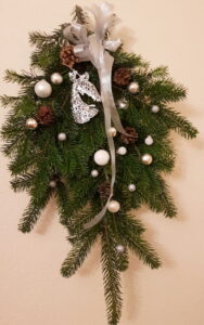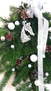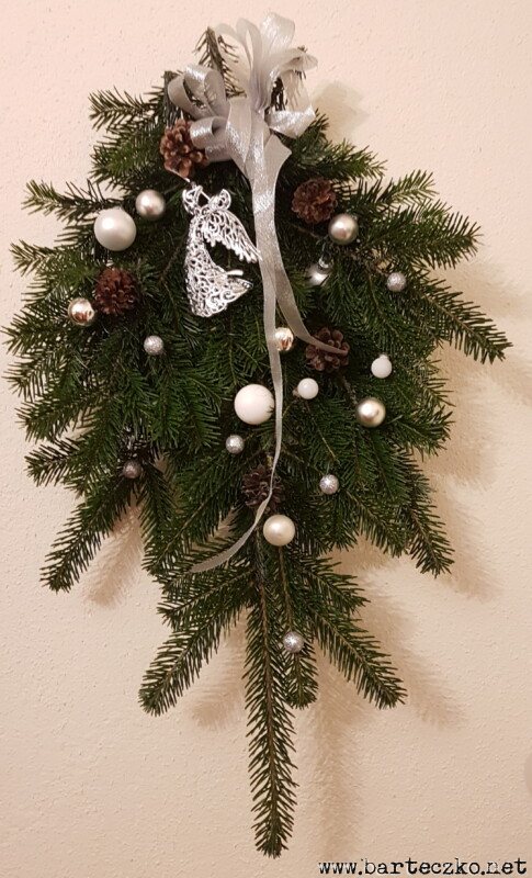 Stroik do zawieszenia na ścianę w minimalistycznej formie: srebrny anioł dmący w róg oznajmia nadejście Bożego Narodzenia. Wokół pada śnieg – to białe , srebrne i brokatowo – srebrne bombki o różnych wielkościach. Zielone jodłowe gałązki i naturalnie brązowe szyszki oznajmiają, że rzecz dzieje się w lesie. Srebrna kokarda jest zwieńczeniem dekoracji i nadaje jej uroczysty charakter.