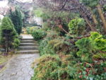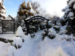 Zimozielony berberys Julianny i niski żywopłocik zmieniły się w jedną zaspę, w oddali widać taras z pergolą nad schodami